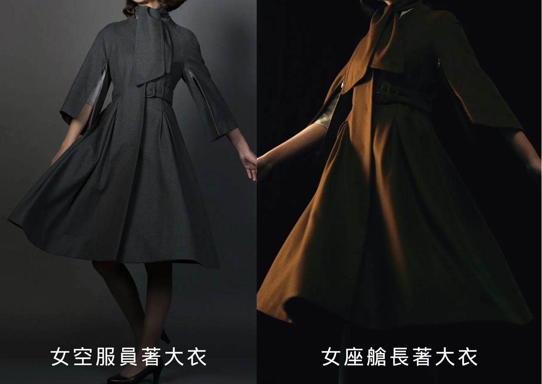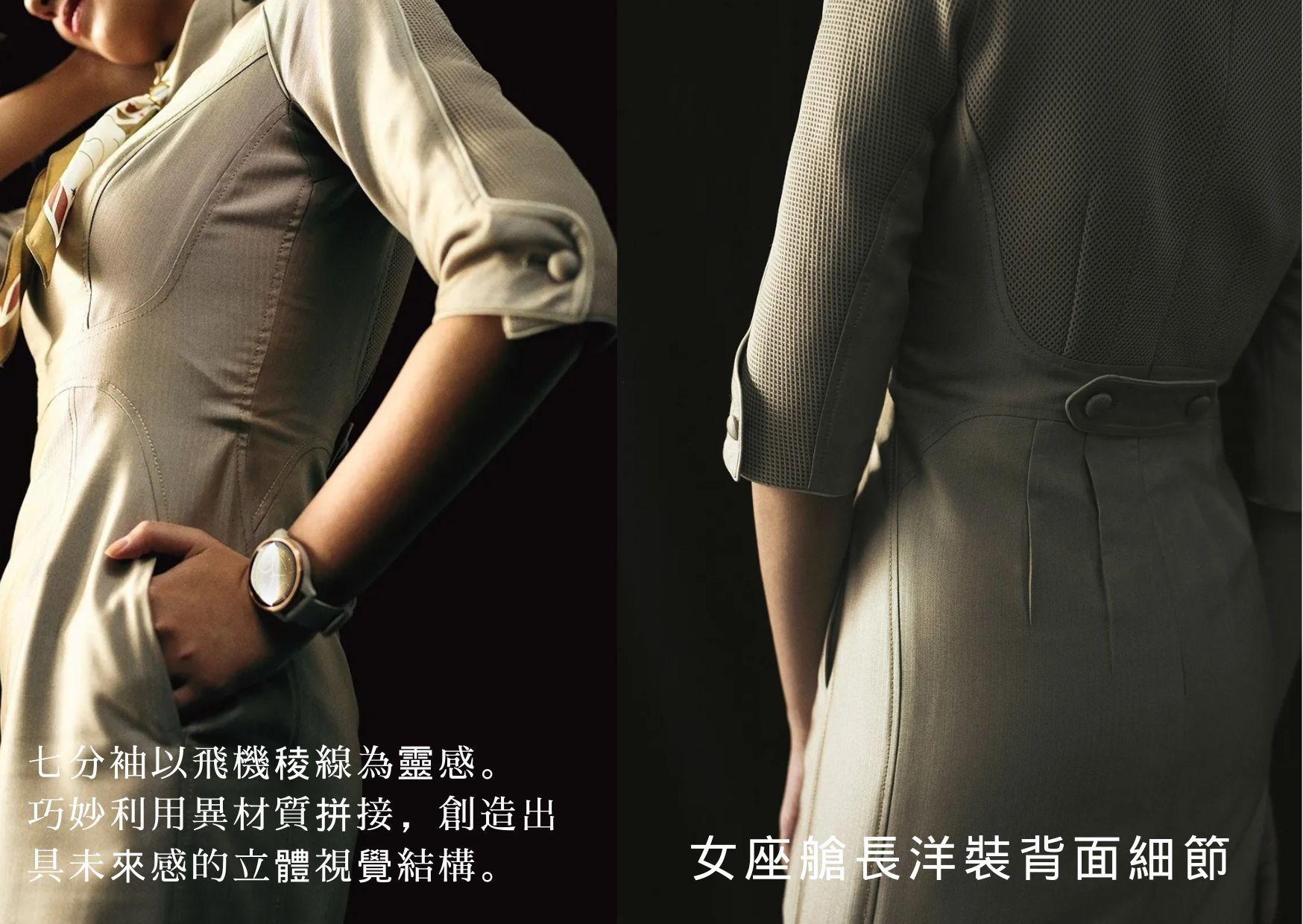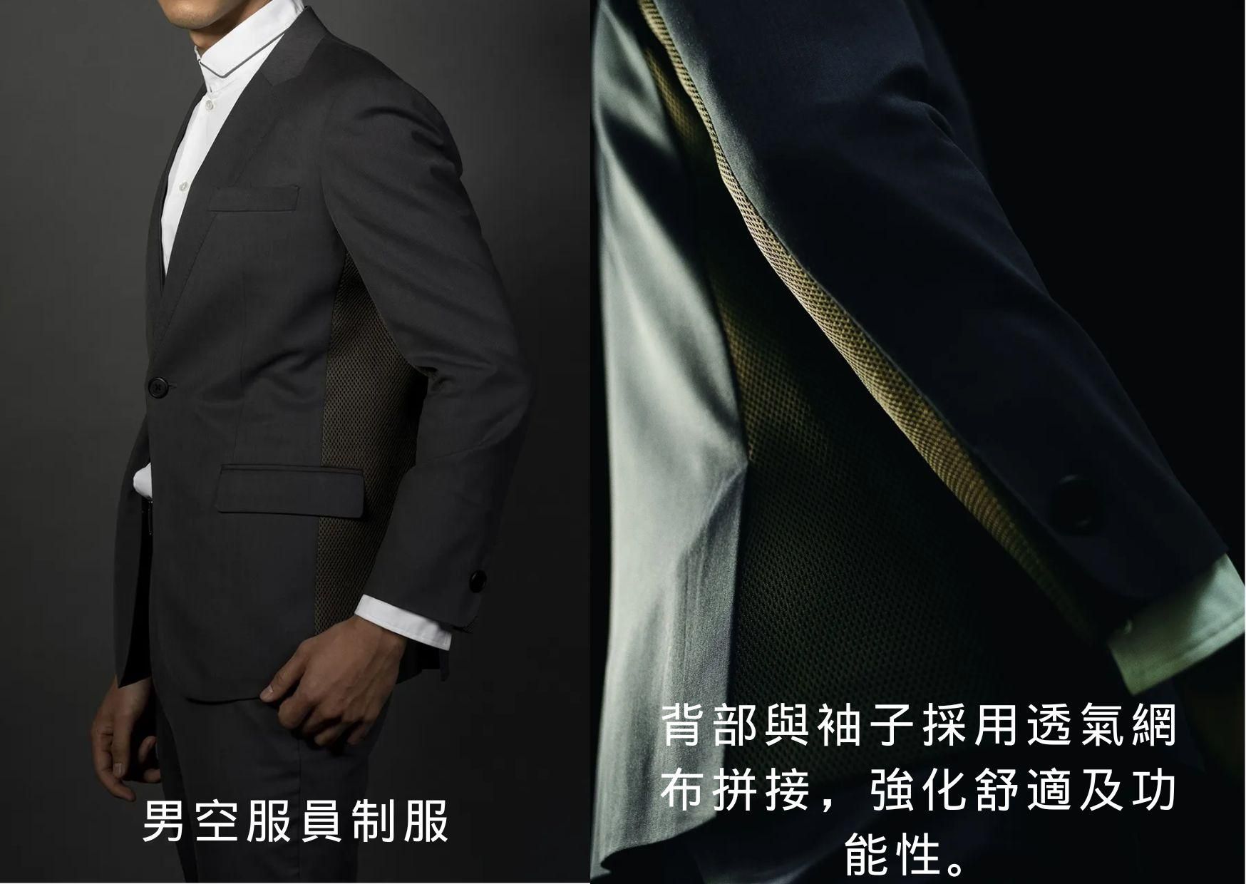 制服以襯衫立領設計來替代緊繫的領帶,並以不同裁片拼接呈現翻領樣式,在接縫處更利用出芽線條展現立體感。