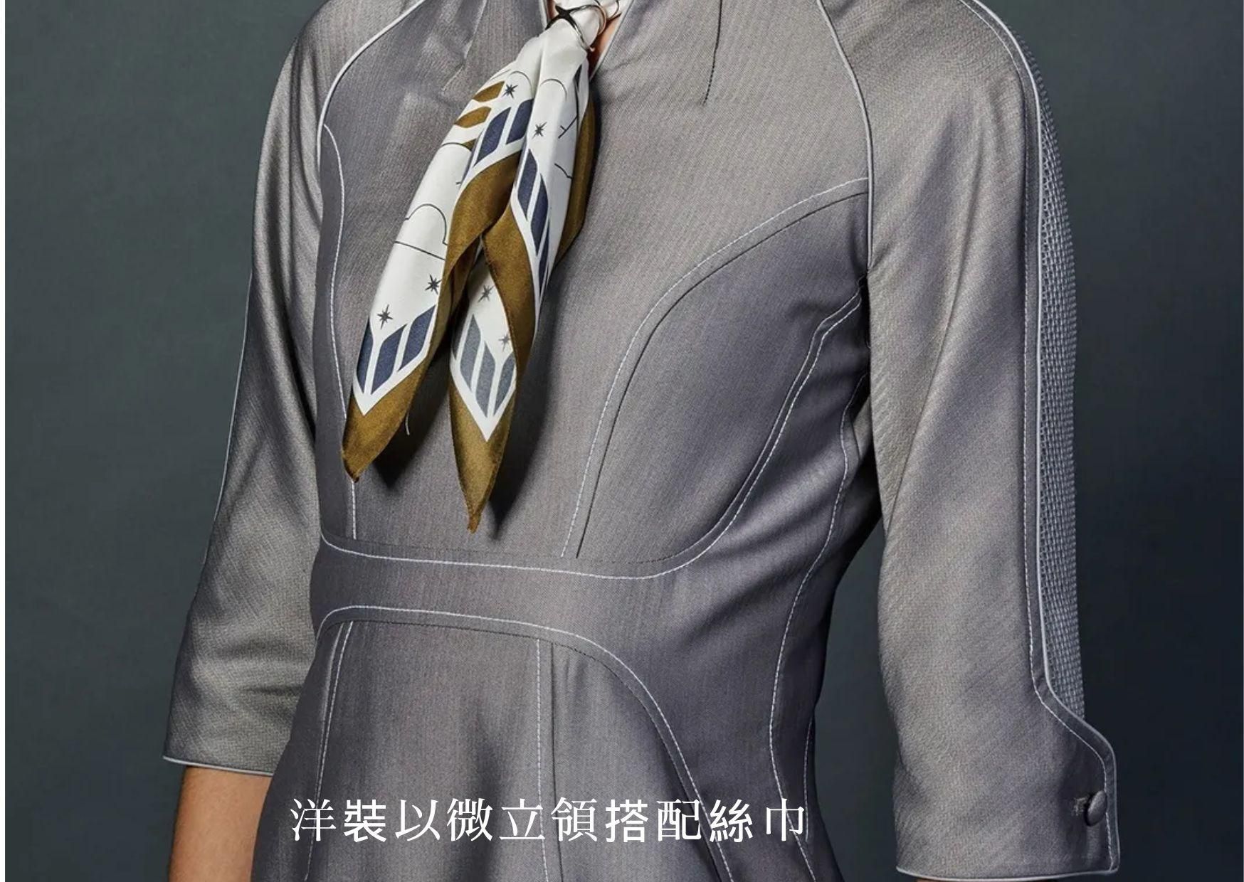 【女性】空服員制服呼應客艙的大地色系(領巾):